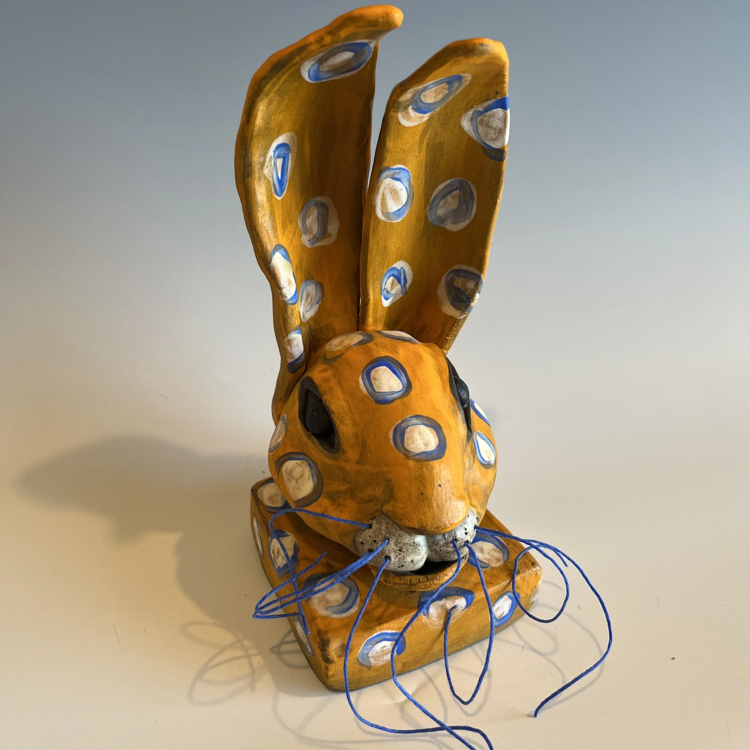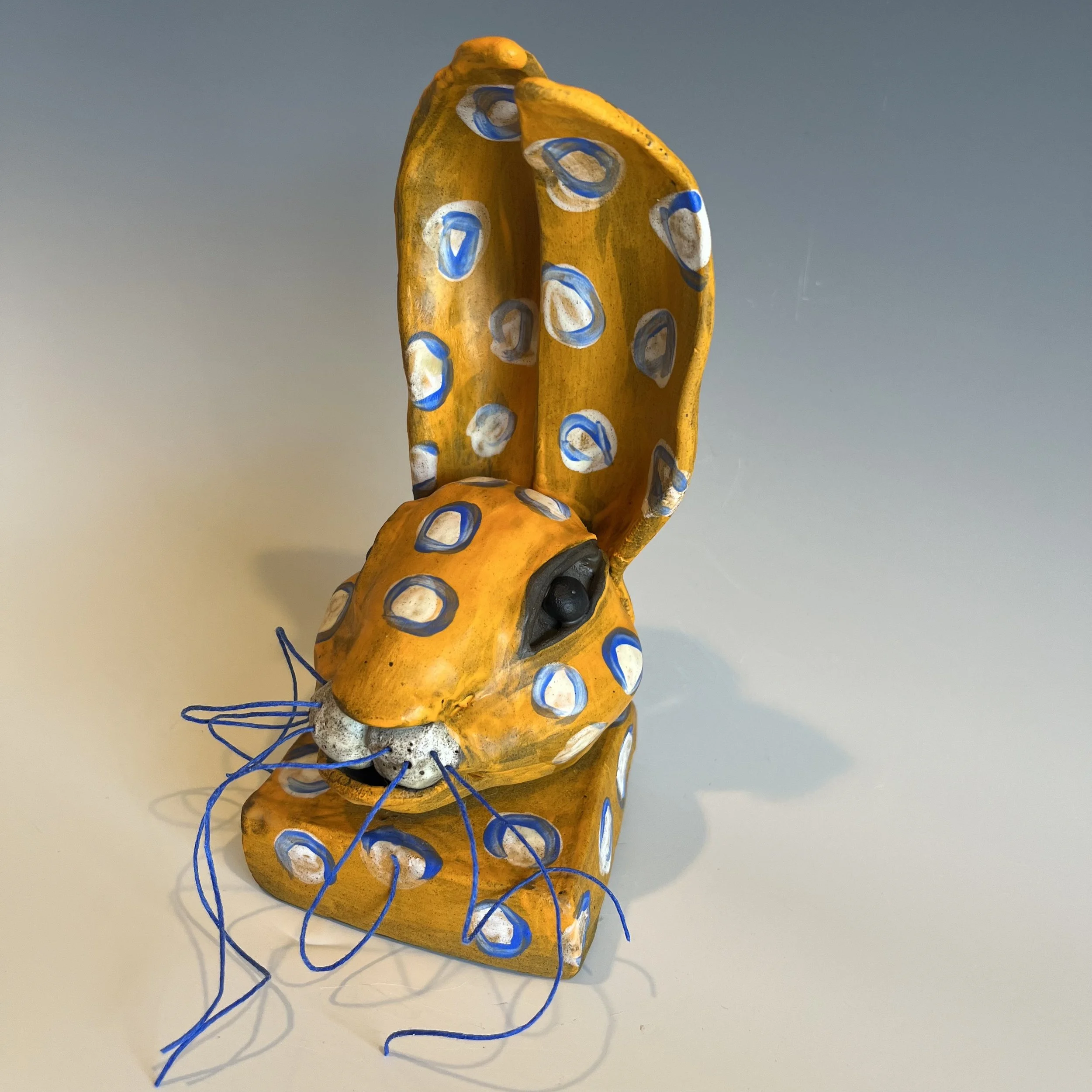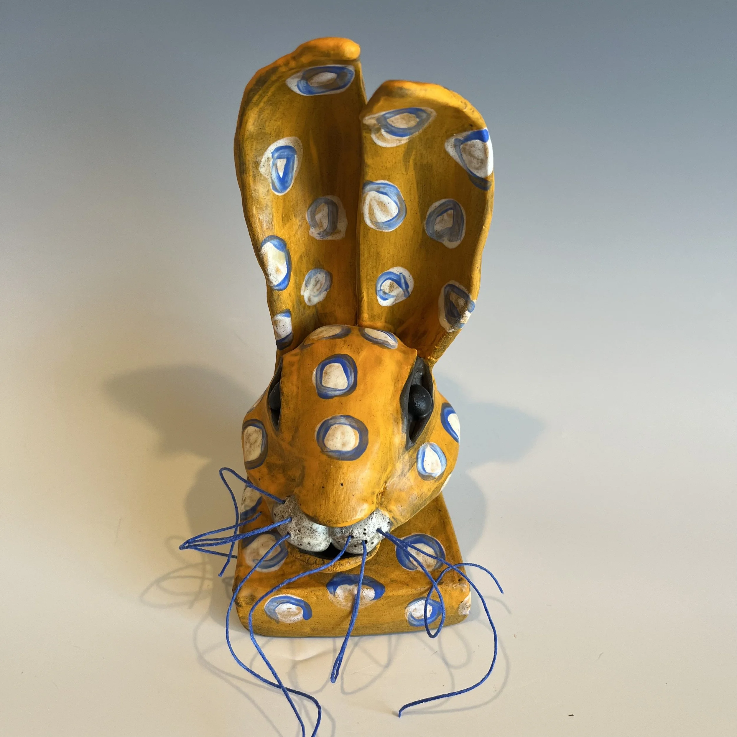 Available Work › "Butterscotch" Image 1 of 4 Image 2 of 4 Image 3 of 4 Image 4 of 4 "Butterscotch" $200.00 5” x 5” x 8”Clay Purchase Added! 5” x 5” x 8”Clay Whimsical rabbit bust with custom whiskers made of stoneware with multiple underglazes fired to cone 6